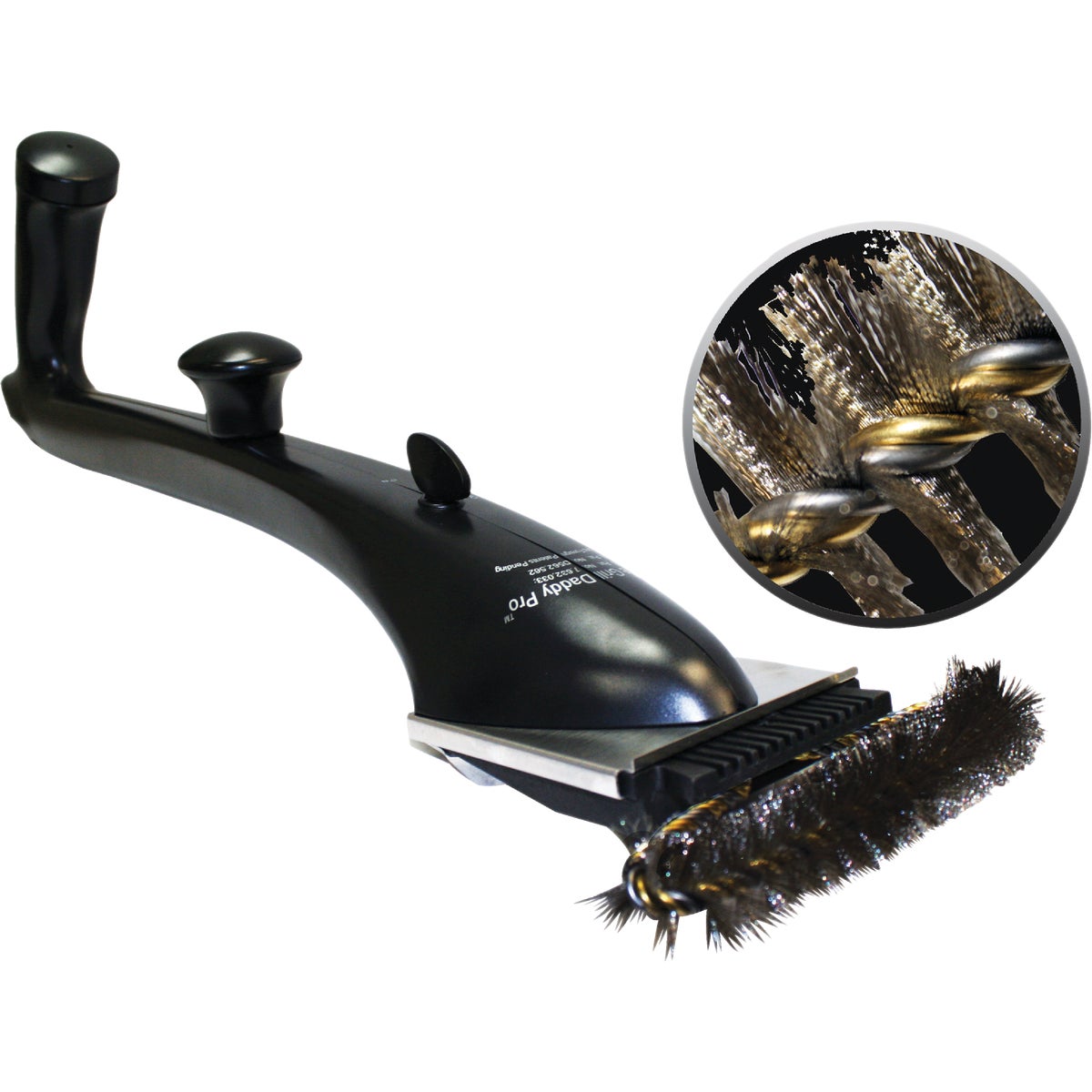 Grill Daddy Pro Steam Cleaning Grill Brush with Bristle-Lock technology locks bristles in place for extra security. Bristles are made with 100% rust proof stainless steel and brass. 22 In. extra long ergo handle keeps hands safe from heat, especially when cleaning large grills. V-shaped scraper wedge breaks up stubborn baked-on residue. Grill Daddy melts away grease and grime on contact. Brush stays grease-free leaving the grill spotless. A measured amount of water is released to generate steam. No toxic chemicals in your food or in the environment. Ergonomic design allows easy handling and gives extra leverage using both hands. Built-in hook. Black Diamond finish withstands the elements.