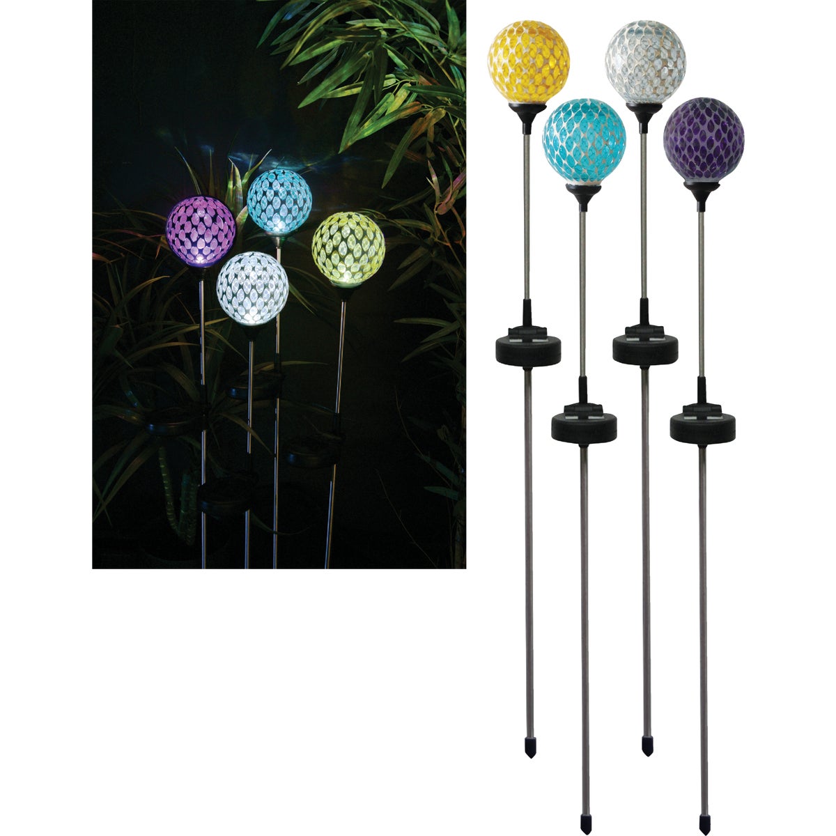 Mosaic glass solar stake light has a solar panel that provides 8 hours of power on a full charge. 4 stunning colors - purple, green, teal, and yellow. Cannot specify color.