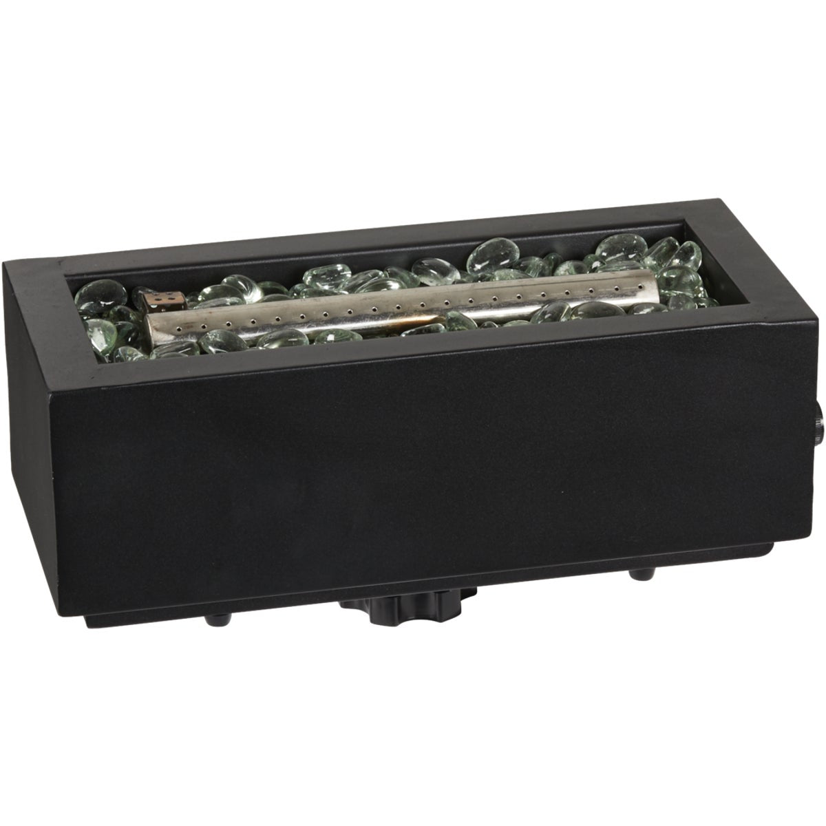 14 In. table top gas fire pit. Uses (1) 1-pound external gas tank. Produces 10,000 BTUs (British Thermal Unit) and is portable, fits and mounts to table umbrella hole. Includes decorative clear fire glass. Bring the warmth and ambiance of a fire pit to your backyard with this LP (liquid propane) portable, rectangular tabletop fire pit. Features a stainless fire bowl that mounts easily to a standard umbrella hole in the table making it an attractive centerpiece for your outdoor living space.