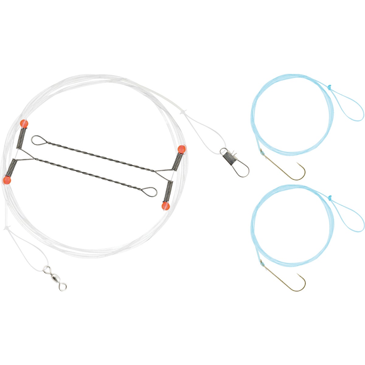 Twin nylon rigs with stainless steel extension arms that allow minnow to swim naturally without touching line. Bottom snap designed for easy sinker attachment. Complete with beads and 2 gold Aberdeen snelled hooks. Ideal for use with crappie and panfish.