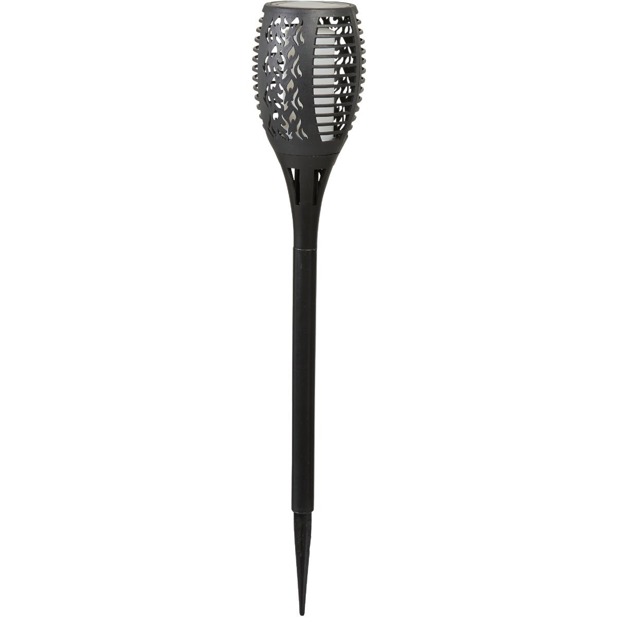 Solar powered black torch path light. Features flamelike flickering LED (light emitting diode). Durable plastic construction.