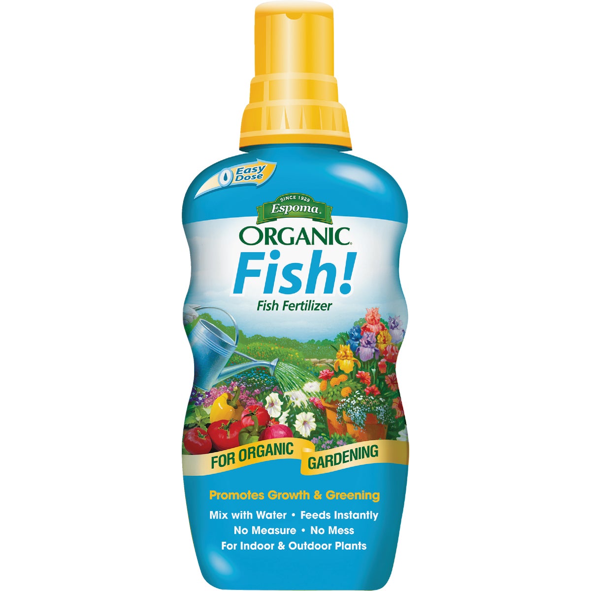 Organic fish emulsion liquid plant food concentrate. Ideal for use in a variety of applications - landscaping, gardens, trees, shrubs, flowers, vegetables, and fruit. Provides major nutrients and beneficial soil microbes for optimum root and plant growth. Features the Espoma Easy Dose cap - no measure, no mess. Makes 35 gallons.
