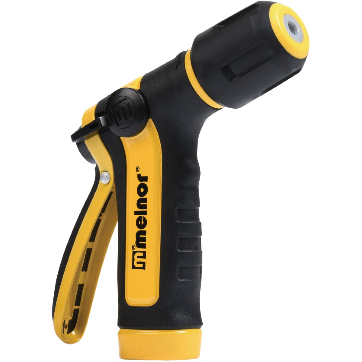Melnor Vortex rear trigger pattern nozzle. 2 spray patterns one for intense cleaning and one for jet pinpoint cleaning. Slip resistant rubberized grips make it easy to hold even when wet. Patented spinning spray action. Great for cleaning gutters, driveways, siding, and concrete pavement. Melnor Lifetime Limited Warranty.