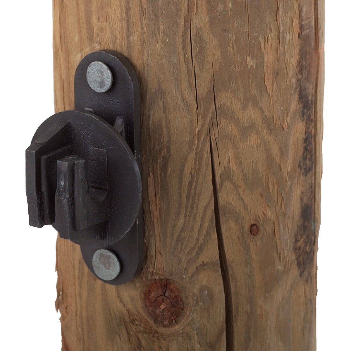 Snug HT insulator for wood posts. Designed for high-tensile use. Perfect for Equi-Rope and temporary fencing. Large diameter flange prevents arcing. Heavy fingers carry wire 3/4-inch from post. Complete with 2 galvanized ring shank nails. Molded of high-density polyethylene. Performs in any climate. Color: Black. 25 per bag. Suitable for high-tensile fencing.