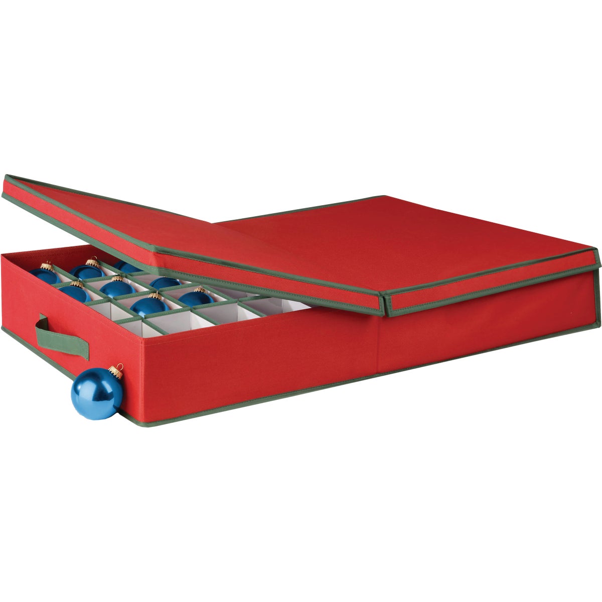 Nylon-polyester ornament storage box with dividers protects keepsake ornaments from damage. Consists of 40 compartments with dividers that can be removed to store larger ornaments. The low profile container can be stored beneath a bed or dresser.