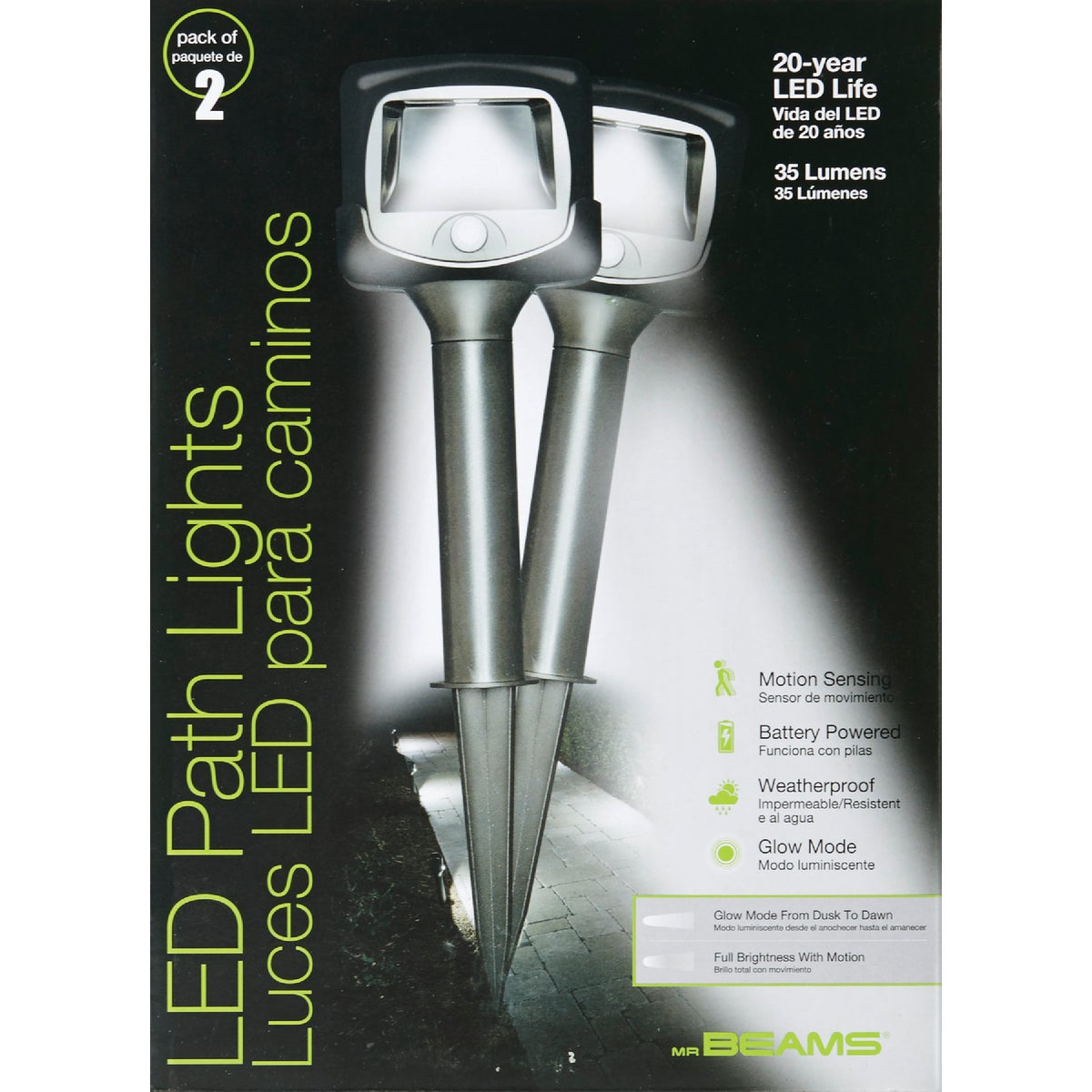 LED (light emitting diode) path lights. Hands free, motion and light sensing lights that can be staked into the ground or mounted on a post or wall to illuminate pathways or walkways. No wiring required. Provides 35 lumens of light and auto shutoff 20 or 60 seconds after motion is no longer detected. Detects motion within 15 feet away and lights 120 square feet. Also features a glow from dusk to dawn function that can be switched on or off. Runs on (3) C batteries for an estimated 12 months. Weatherproof, ultraviolet resistant plastic housing. Color temperature: 4000K.