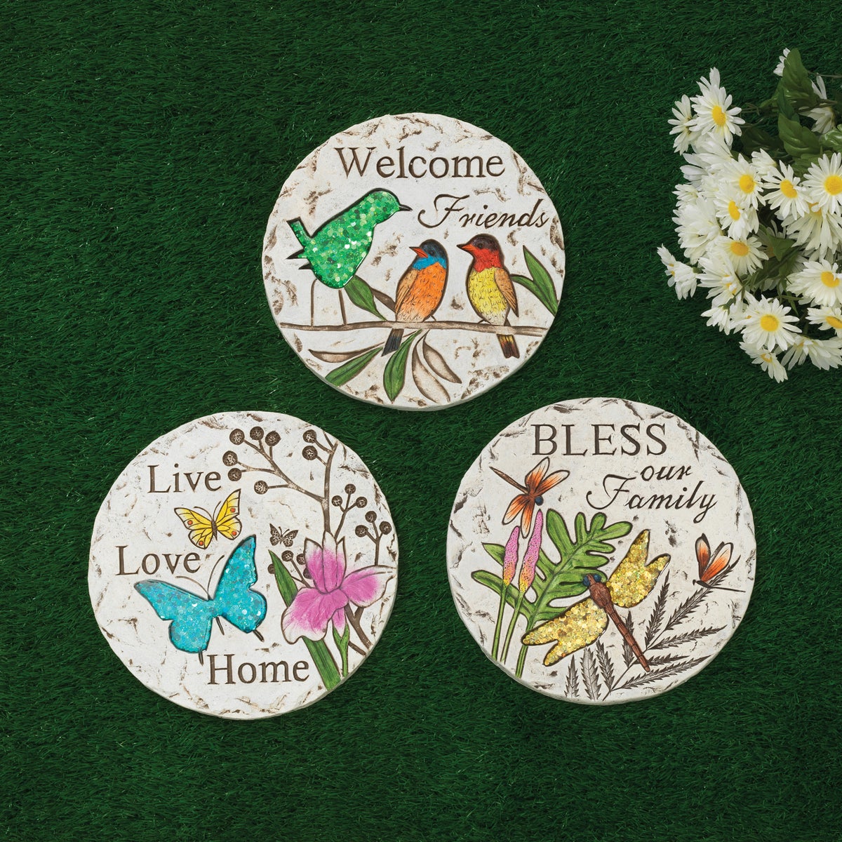 10-inch cement spring garden stepping stone. Available in 3 colorful designs: Welcome with etched birds; Live, Love, Home with Butterflies; and Bless our Family with Dragonflies. Cannot specify design.